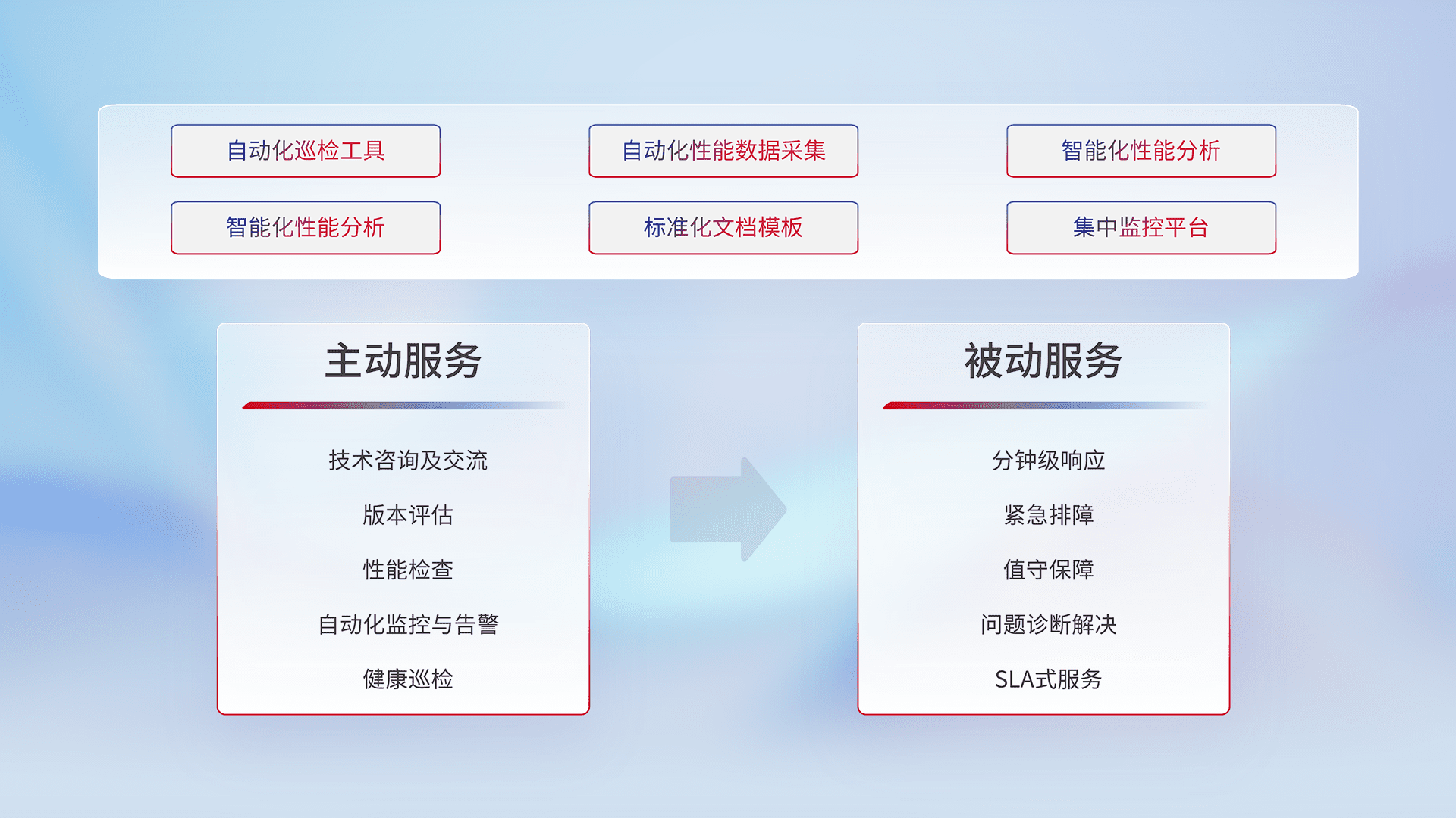 智能化工具和标准化文档,,,,保障服务质量,,,提供主动服务(包含技术咨询、、版本评估、、、性能检查、、自动化监控与告警、、健康巡检)和被动服务包含(分钟级响应、、、紧急排障、、、值守保障、、、问题诊断解决、、SLA服务)。。。。